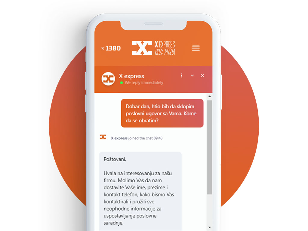 U cilju brže i jednostavnije komunikacije, za sve naše korisnike, omogućili smo novu uslugu - Web Chat. Ukoliko posjetite našu web stranicu, putem ove savremene usluge možete se informisati o tome na koji način da pošaljete paket ili koliki je iznos dostave. Istovremeno, putem Web Chat-a možete dobiti informacije o našim osnovnim i dodatnim uslugama, zonama isporuke pošiljki i načinima saradnje sa X express brzom poštom.
