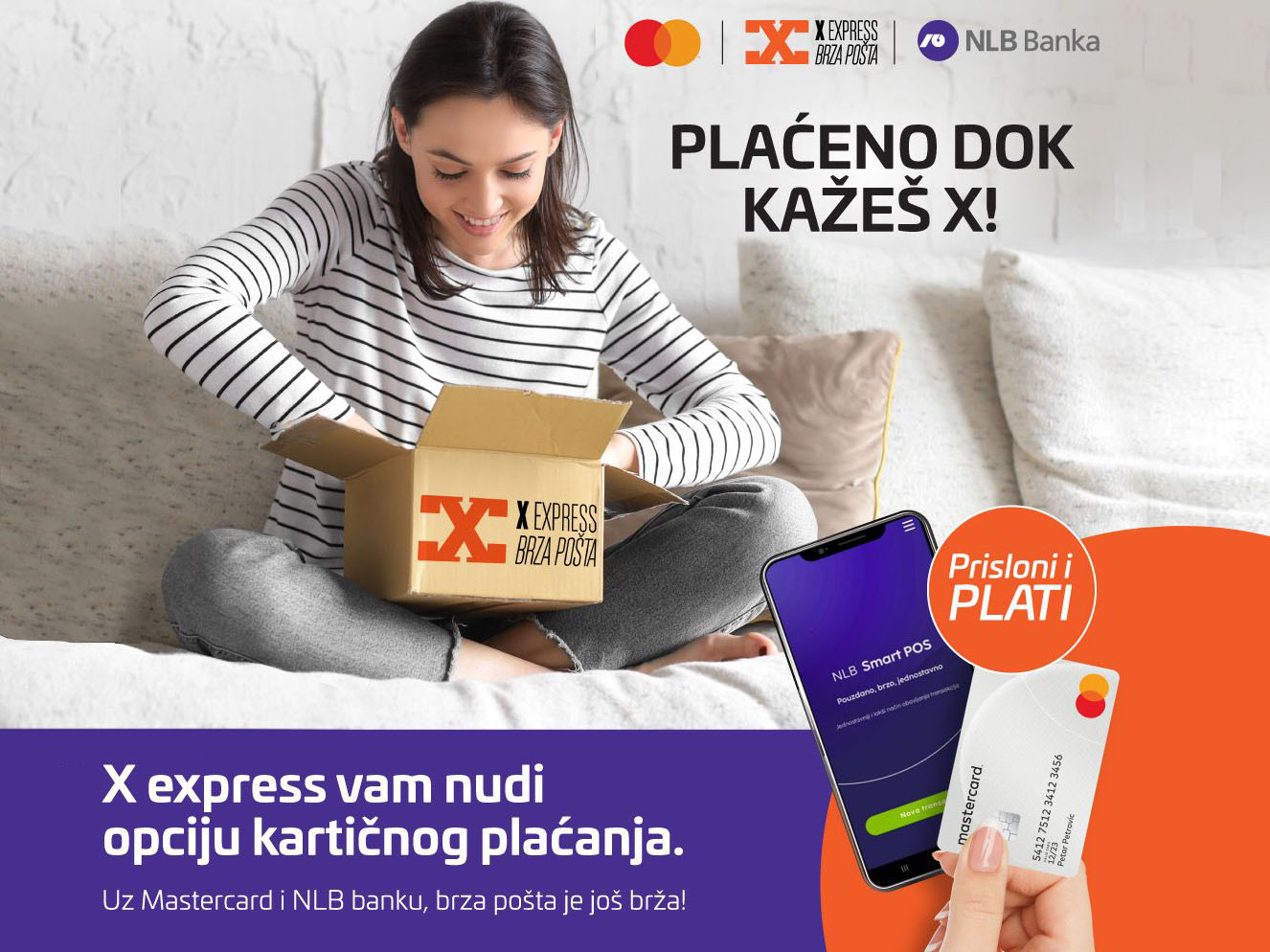Prvi put na BiH tržištu, zahvaljujući X express brzoj pošti, NLB Banci i Mastercard-u predstavljena je nova usluga - jednostavno i sigurno plaćanje karticom kod kurira u trenutku preuzimanja pošiljke. Od sada, korisnici X express-a, neće morati više da brinu da li imaju dovoljno gotovine pri ruci kad ih kurir pozove već se moći da preuzmu svoj paket i plate cjelokupan iznos karticom, što je omogućeno korišćenjem NLB Smart POS aplikacije od NLB Banke a.d. Banja Luka, koja osigurava sigurnu i efikasnu transakciju.